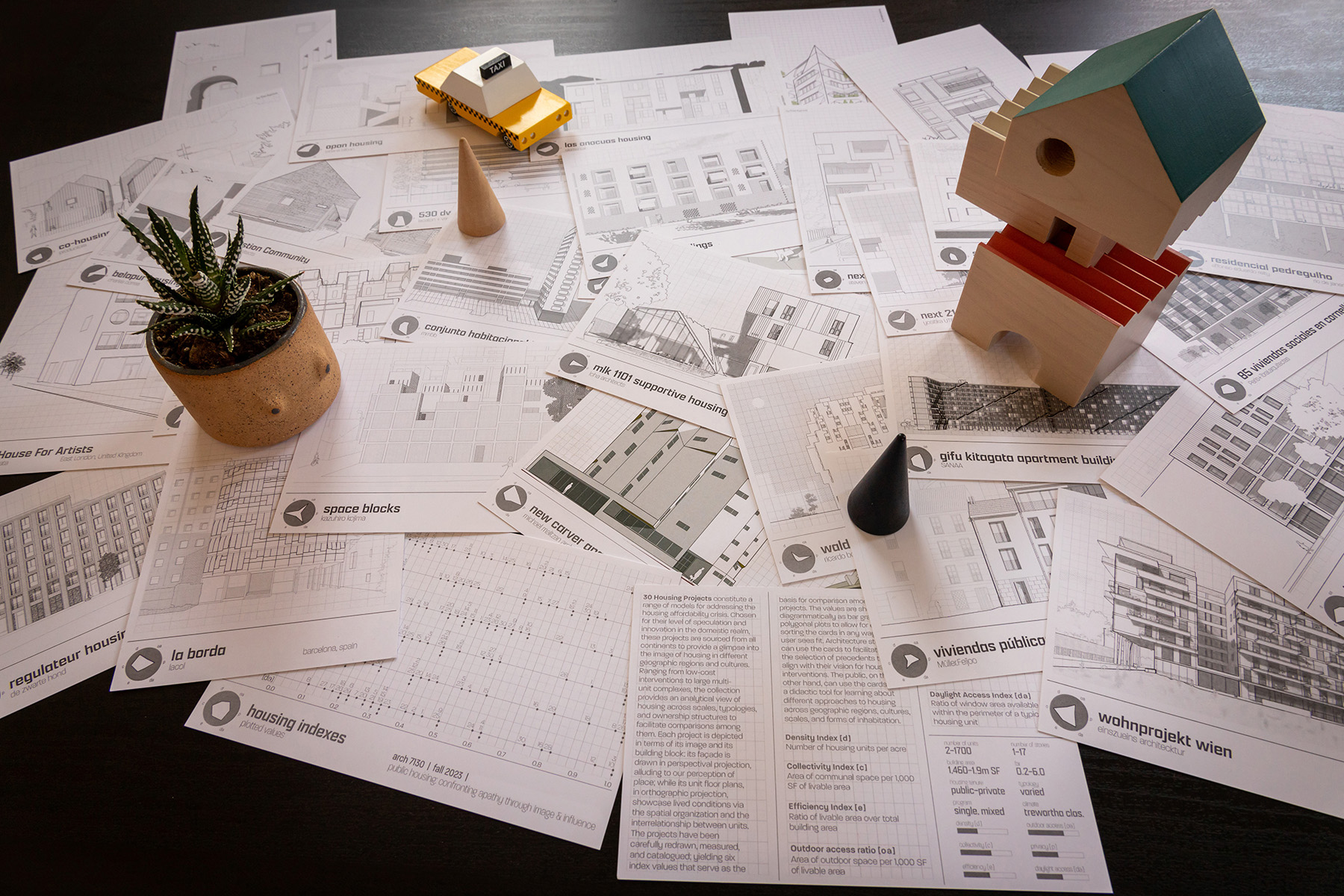 The projects have been carefully redrawn, measured, and catalogued; yielding six index values that serve as the basis for comparison among the projects. The values are shown diagrammatically as bar graphs and polygonal plots to allow for easy sorting the cards in any way the user sees fit. Architecture students can use the cards to facilitate the selection of precedents that align with their vision for housing interventions. The public, on the other hand, can use the cards as a didactic tool for learning about different approaches to housing across geographic regions, cultures, scales, and forms of inhabitation.
